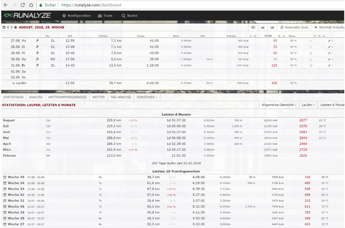 Kommen wir – wie gewohnt – zu den Fakten: Der August schlägt mit 255,80 km zu Buche (siehe Abbildung 1). Ich laufe nun seit 243 Tagen mindestens eine Meile, wobei ich aber bis jetzt noch nie diesen Joker „ziehen musste“. Im Schnitt sind es ca. 8 Kilometer am Tag – also so gesehen: Keine unmenschliche Leistung. Aber: Mehr als im Juli, aber auch weniger als im März, April und Mai. Und bedenkt man, dass ich das mit einem verletzten Außenband im rechten Sprunggelenk gelaufen bin, dann staune ich schon auch selbst am heutigen Tag.