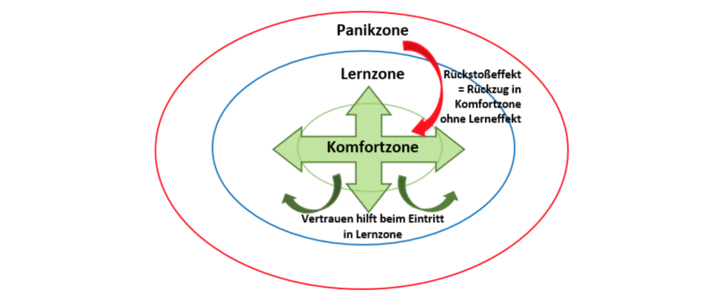 Lernen findet statt, wenn wir unsere Komfortzone verlassen und die Lernzone betreten. „Sicherheit, Geborgenheit, Ordnung, Bequemlichkeit, Entspannung, Genuss“ (Michl 2009) charakterisieren die Komfortzone und stellen somit uns vertraute, bekannte Umgebungen bzw. alltägliche Situationen dar, in den wir uns sicher bewegen und bereits viele Erfahrungen gesammelt haben.