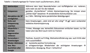 Bevor der Trainer seine Marschroute für den weiteren Spielabschnitt seiner Mannschaft mitteilt, ist es notwendig, sich zuvor von der erlebten Beanspruchung gedanklich und körperlich zu lösen (LEA). In dieser Distanzierungsphase muss der Ärger oder die Freude raus gelassen und ggf. untereinander kommuniziert werden. Unmittelbar im Anschluss sollte dann auf Ruhe und Entspannung umgeschaltet werden, mit dem Ziel „den Kopf frei bekommen“. Dadurch initiiert man stückweise die Erholung (LEA). In dieser Phase nimmt der Trainer eine sehr sensible Funktion ein, denn die Spielerkenntnisse (Was war gut? Wie ist die Marschroute?) muss erholungsunterstützend eingebracht werden. In der dritten Phase steht dann die gedankliche und körperliche Aktivierung im Vordergrund (LEA). Ziel ist es hier, die Spieler wieder auf der kommenden Anforderung des Wettkampfes einzustimmen. Der Aktivierungsprozess sollte zu einem verbal durch den Trainer („Auf geht`s!), als auch durch körperliche Mobilisation durch die Spieler beschleunigt werden. Tabelle 1 fasst eine mögliche Halbzeitgestaltung schematisch zusammen.