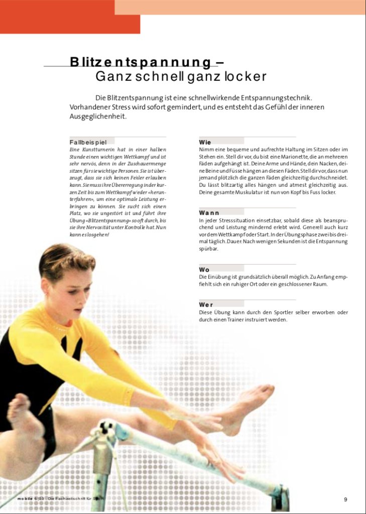 Oder die Blitzentspannung (siehe Bilder), welche mit inneren Bildern von Leichtigkeit arbeitet und innerhalb einiger Sekunden ein spürbares, muskuläres Entspannungsgefühl auslöst. Diese Technik kann jederzeit, auch im unmittelbaren Vorfeld des Wettkampfes in die Vorstartroutine eingearbeitet werden.