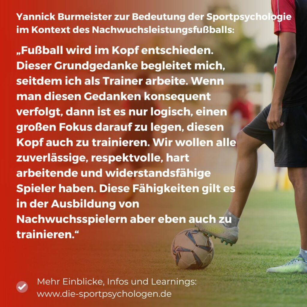 Zusammenfassend möchte ich kurz und knapp aufzeigen, warum die Sportpsychologie im Nachwuchsleistungsfußball schlichtweg alternativlos ist: Gerade in jungen Jahren sollte die Weiterentwicklung des Spielers und des Menschen dahinter im Vordergrund stehen. Dafür benötigt es eine Ganzheitlichkeit, sprich ein gezieltes Entwickeln technischer, taktischer, vor allem aber auch sozialer und mentaler Kompetenzen. Zudem braucht es eine systemische Herangehensweise, die auch z.B. eine proaktive Elternarbeit vorsieht. Diese lässt sich, ebenso wie die gerade angesprochene Ganzheitlichkeit, nur durch das Zusammenspiel von Fußballtraining und Sportpsychologie erzielen. Denn Trainer allein können der Summe der zu vollziehenden Handlungsschritte, die es für eine solche ganzheitliche Ausbildung braucht, gar nicht gerecht werden. Es braucht in einem Funktionsteam also zusätzlich zu Experten für das Physische auch Experten für das Psychische. Zudem ist der Trainer aufgrund seiner Rolle als Entscheider oftmals dazu gezwungen, zuerst den Spieler und erst dann den Menschen zu betrachten, denn er stellt primär nach sportlicher Leistung auf. Der Sportpsychologe dagegen fokussiert sich vielmehr auf den Menschen hinter dem Spieler, unterstützt den Trainer dabei, die zwischenmenschlichen Beziehungen zu den Spielern im Auge zu behalten und zu fördern und kann dadurch positiven Einfluss auf ihre Leistungsfähigkeit und ihr Wohlbefinden nehmen. Des Weiteren geht es im Nachwuchsleistungsfußball um das Erbringen von sportlicher Leistung. Dies führt zu hohen Anforderungen und Erwartungshaltungen, was wiederum die Entstehung von übermäßigem Leistungsdruck begünstigen kann. Der Sportpsychologe kann die Systembeteiligten wie Spieler und Trainer dabei unterstützen, einen stimmigen Umgang mit diesem Druck zu erlernen und einen positiven intrinsischen Leistungswillen zu fördern. Außerdem: Der Körper führt die Handlung aus, aber der Kopf steuert diesen, entscheidet über die Einsatzbereitschaft und Motivation, die Herangehensweise, Widerstände zu überwinden, den Umgang mit Misserfolgen und auch – auf das Team bezogen – die Art der Zusammenarbeit sowie die Entstehung und Weiterentwicklung einer Gemeinschaft. Umso wichtiger erscheint es vor diesem Hintergrund, den Kopf gezielt zu trainieren, oder?