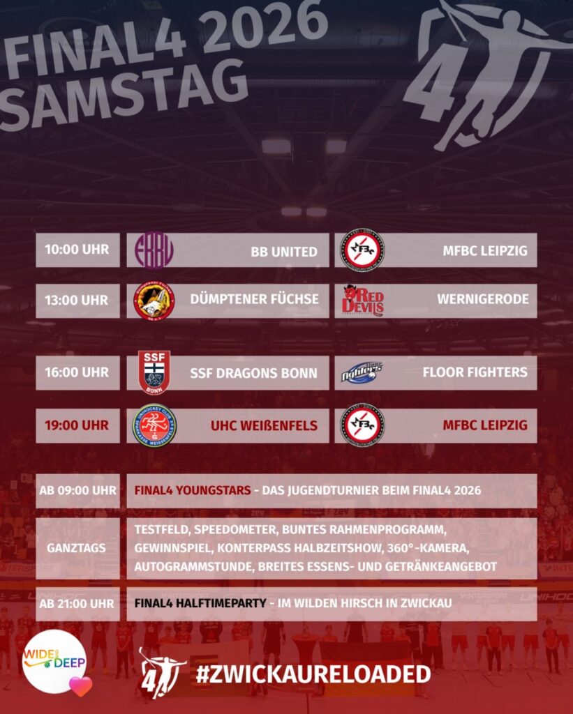 Das Final4, das Pokalfinalwochenende, ist das größte Event im Jahreskalender von Floorball Deutschland. In der Sparkassen Arena Zwickau spielen vier Herren- und vier Frauenteams um den ersten Titel der Saison 2025/2026. Darüber hinaus ist ein umfangreiches wie spannendes Rahmenprogramm geboten – die Sportpsychologie ist einer der Bestandteile. Das Beste: Interessierte können vor Ort Kontakt zu einigen Experten und Expertinnen von Die Sportpsychologen aufnehmen.
